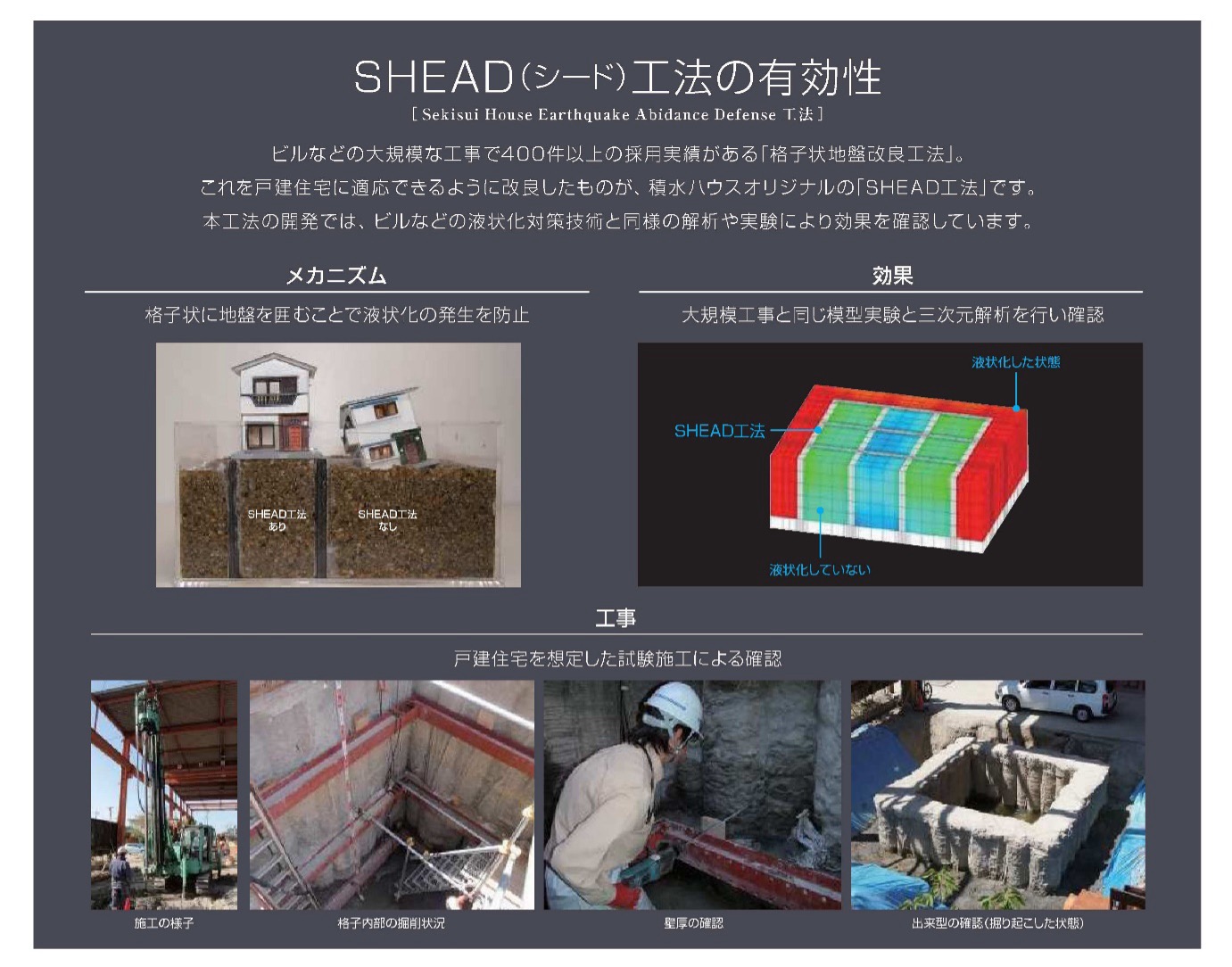 東日本大震災では多くの方が液状化被害にあわれました。住宅を供給する立場として液状化対策が必要だと考え、SHEAD工法を株式会社竹中土木様と共同で開発しました。土木分野や大型建築物では実績のある工法ですが、戸建て住宅用の施工をできるように改良した点がポイントです。